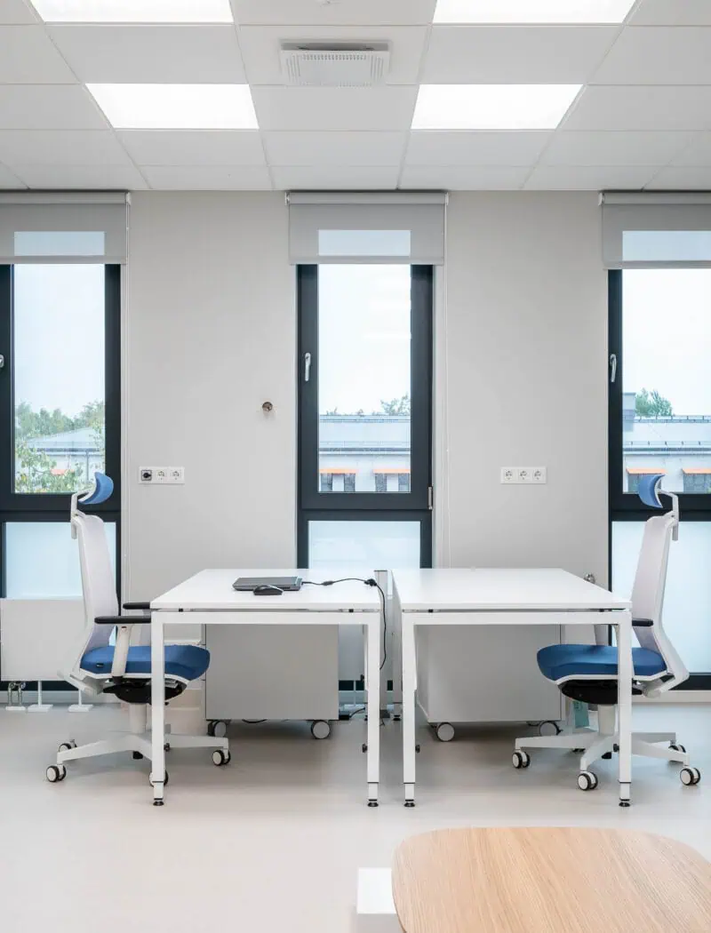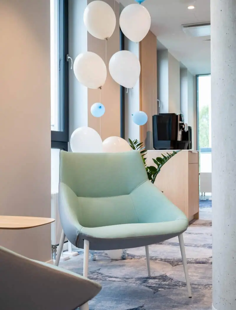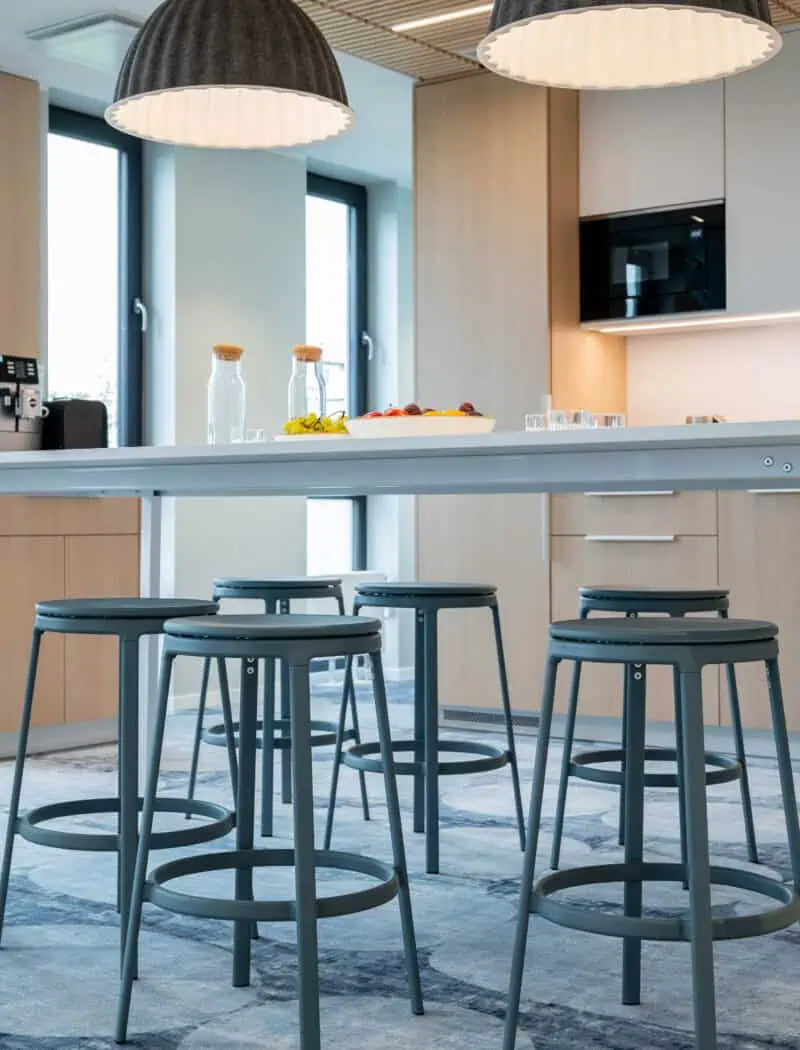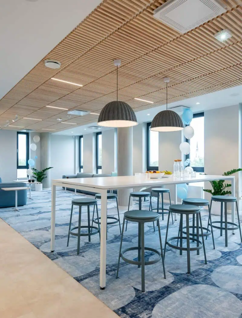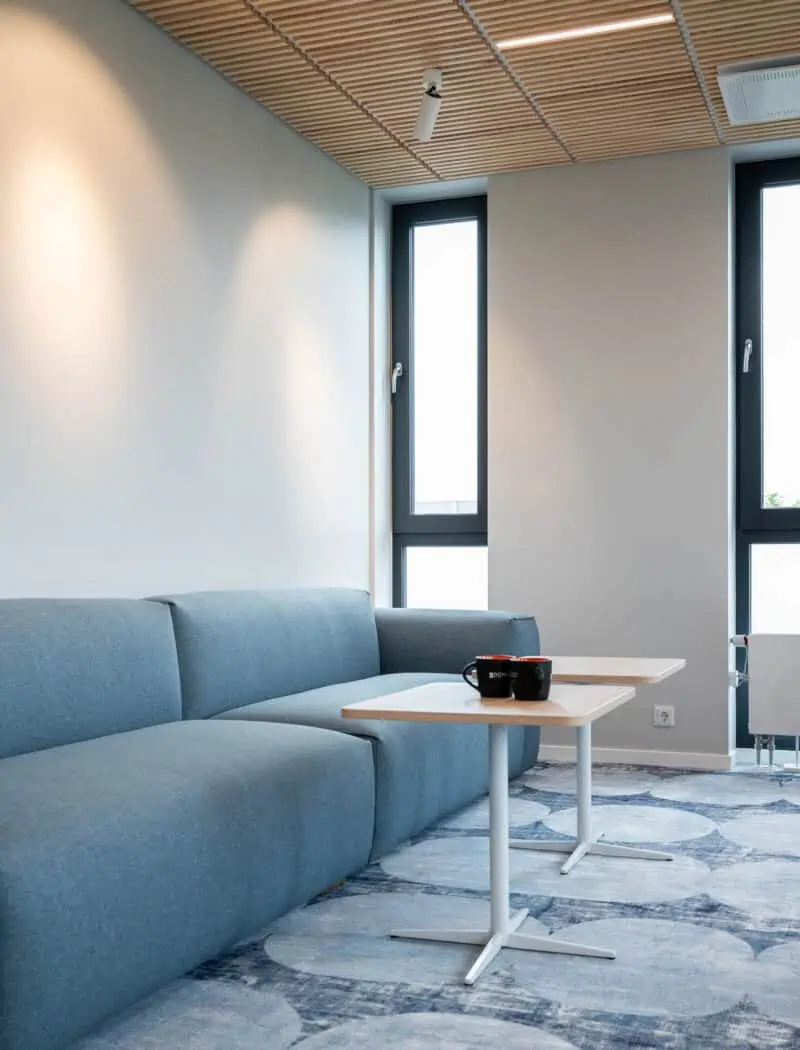 Personaliruumides ja juhtkonna aladel on säilitatud ettevõtte signatuurvärv – peen murtud sinakas toon –, mis loob koos naturaalse puitdekooriga hubase ja tasakaalustatud õhkkonna. Korpusmööbel, mille disainis on kasutatud looduslikku puitu, lisab ruumidele soojust.