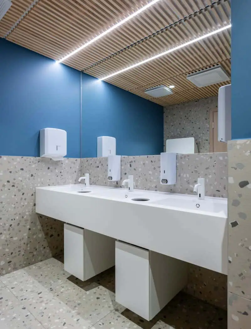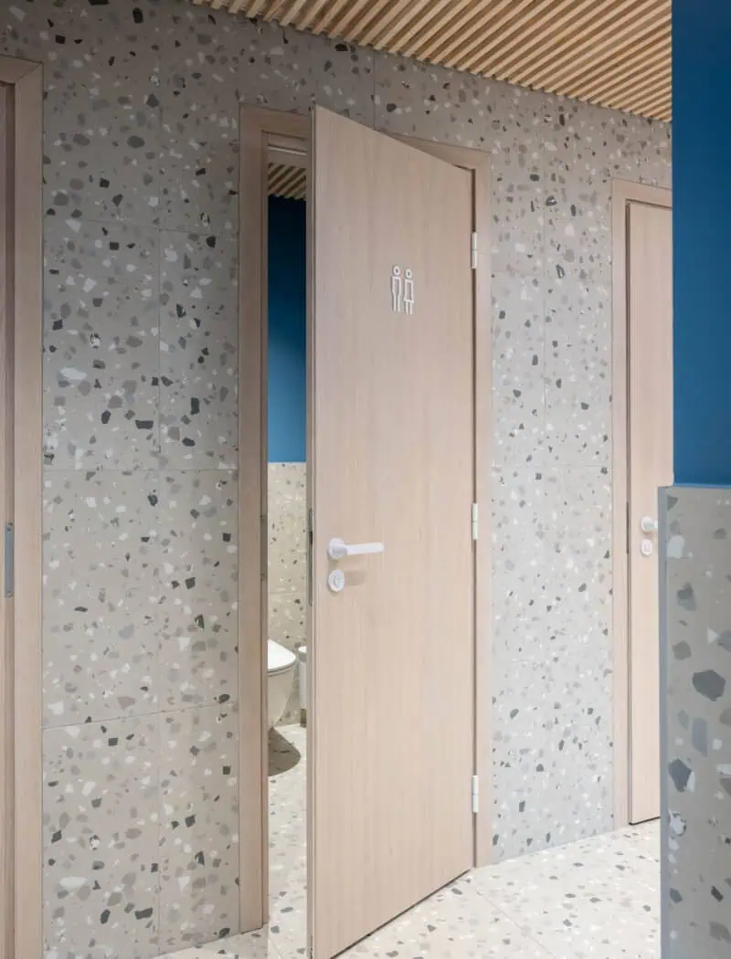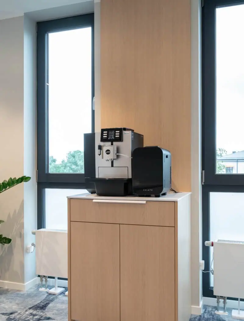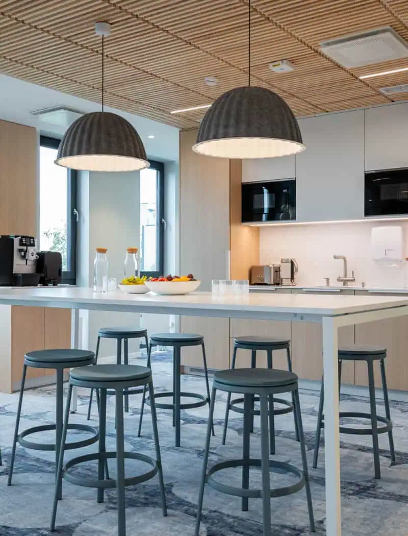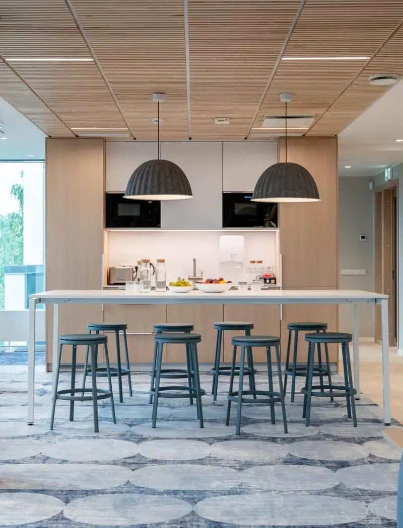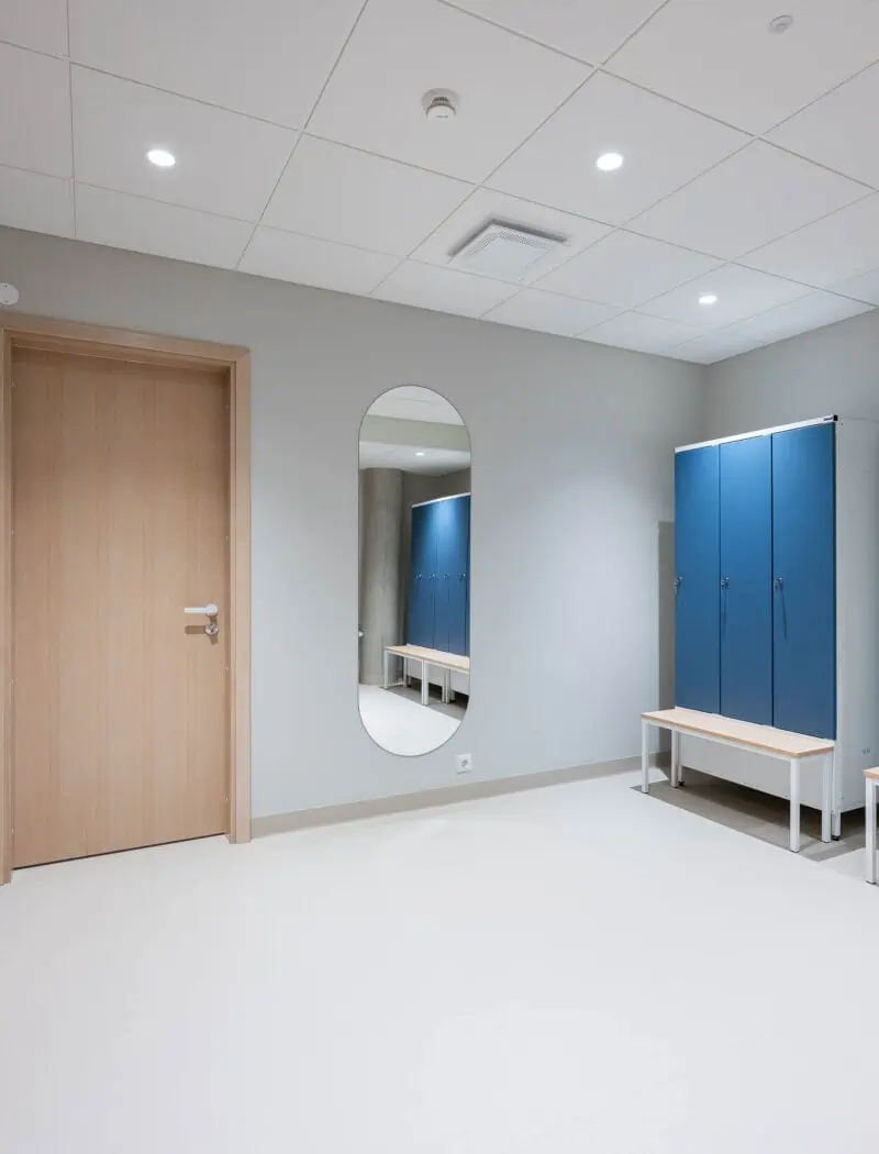 Personaliruumides ja juhtkonna aladel on säilitatud ettevõtte signatuurvärv – peen murtud sinakas toon –, mis loob koos naturaalse puitdekooriga hubase ja tasakaalustatud õhkkonna. Korpusmööbel, mille disainis on kasutatud looduslikku puitu, lisab ruumidele soojust.